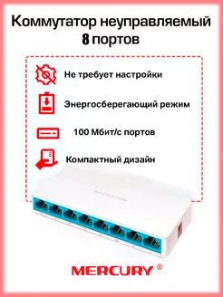 Коммутатор 8 портов, свитч RJ45 неуправляемый
