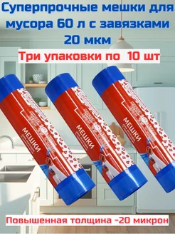 Суперпрочные мешки для мусора 60 л с завязками 3х10 шт