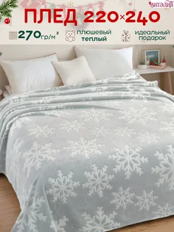 Серый новогодний плед 200х220 см, белые снежинки на кровать