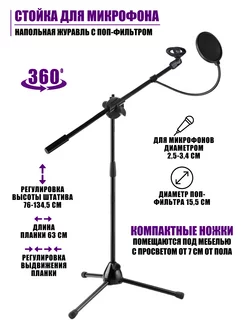 Стойка для микрофона напольная журавль с поп-фильтром