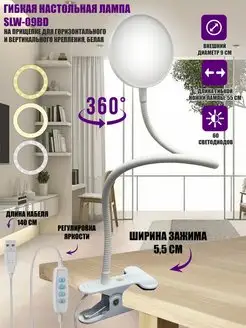 Гибкая настольная лампа SLW-09bd на прищепке, белая