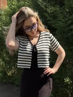 Вязаный летний топ на завязках в полоску