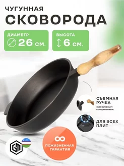 Сковорода чугунная 26 см глубокая с деревянной ручкой