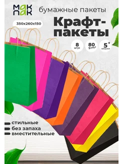 Подарочный крафт пакет с рисунком и ручками 26х15х35 см, 8шт