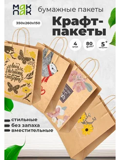 Подарочный крафт пакет с рисунком и ручками 26х15х35 см, 4шт