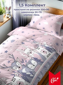 Постельное белье 1.5 на резинке хлопок 200х90 Зверята