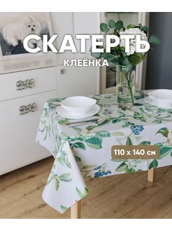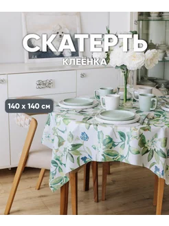 Скатерть клеенка белая с зелеными листьями и цветами 140х180