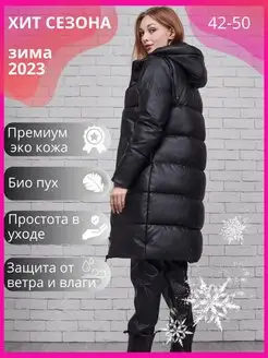 Куртка пуховик женский зимний длинный экокожа с капюшоном