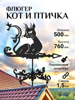 Флюгер садовый декор средний Кот и птичка 500х760 мм