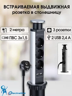 Розетка чёрная с USB выдвижная встраиваемая 2 м 3х1,5 мм2