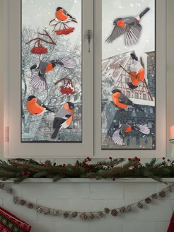 новогодние наклейки на окна Снегири на стену