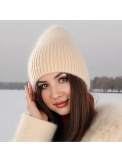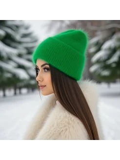 шапка вязаная бини ангора теплая демисезонная с отворотом