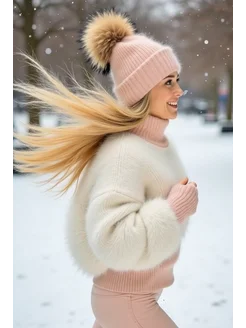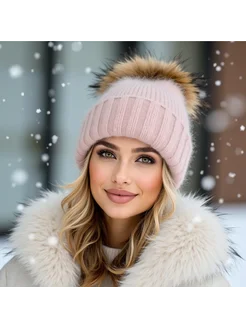 шапка ангора с меховым помпоном зимняя пушистая стильная