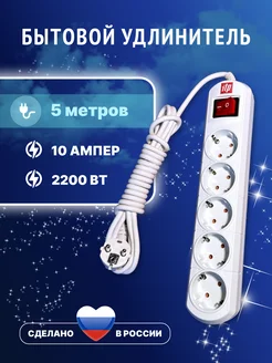 Удлинитель сетевой 5 розеток с заземлением, 5 метров