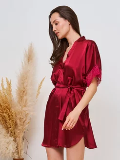 Халат шелковый домашний пеньюар с кружевом большие размеры
