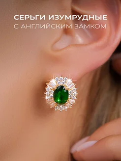 Позолоченные серьги крупный зеленый камень фианит Charlotte