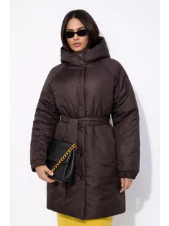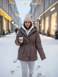 Куртка зимняя удлиненная теплая с поясом капюшоном -20