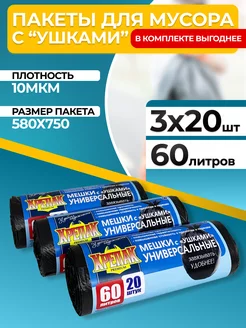 Пакеты для мусора с ушками 60 л 60 шт прочные