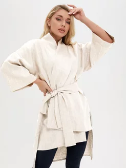 Удлиненный жакет Кимоно Лён на запах оверсайз на поясе