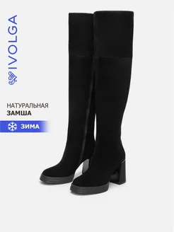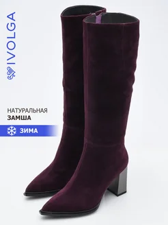 Ботфорты с широким голенищем замшевые зимние на каблуке