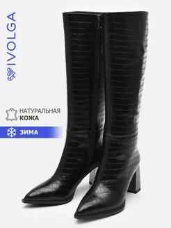 Сапоги на каблуке кожаные под рептилию зимние черные