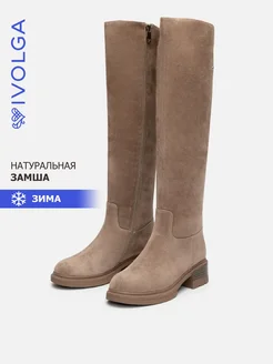 Ботфорты на среднем каблуке зимние замшевые бежевые