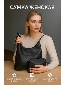 сумка тоут, шоппер черная, с косметичкой