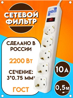 Сетевой фильтр удлинитель, 2200Вт, 10А, 0.5 м