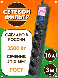Сетевой фильтр, 3500Вт, 16А, 6 розеток, чёрный, 3 м
