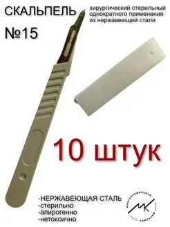 Скальпель хирургический из нержавеющей стали №15, 10 штук