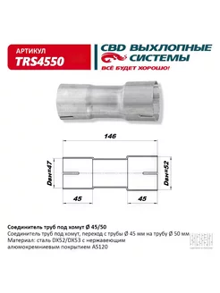 Соединитель труб под хомут, переход с D45 мм на D50 мм