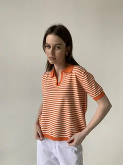 Кофта поло в полоску трикотажная с коротким рукавом оверсайз