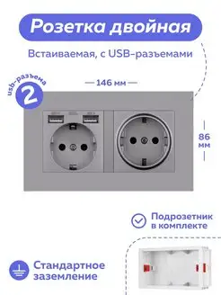 Двойная розетка с USB, серая