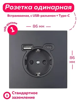 Розетка одинарная с usb и type-c черная