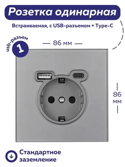 Розетка одинарная с usb и type-c серая