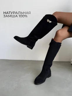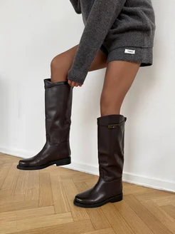 Зимние сапоги на низком каблуке с широким трубы голенищем