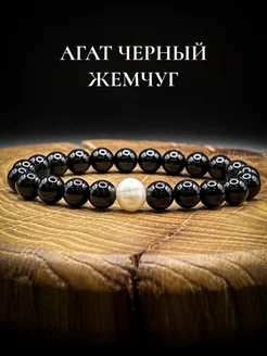 Браслет Агат Черный (ТОН) натуральный 8 мм и Жемчуг