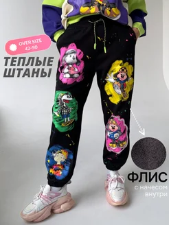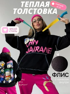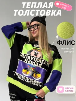 Толстовка с капюшоном теплая на флисе оверсайз с принтом