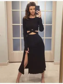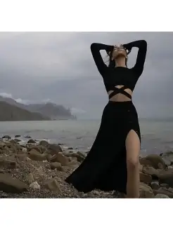 Костюм вязаный черный юбка макси топ на завязках