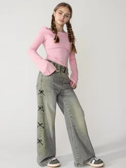 Утепленные широкие джинсы с бантиками