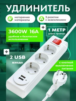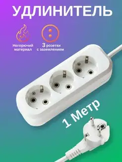 Удлинитель сетевой 3 розетки с заземлением, 1 метр, 16А