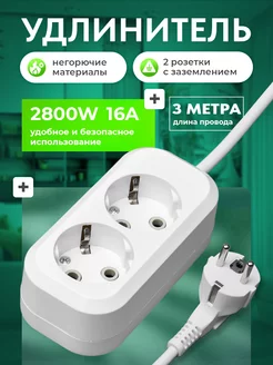 Удлинитель сетевой 2 розетки с заземлением, 3 метра, 16А