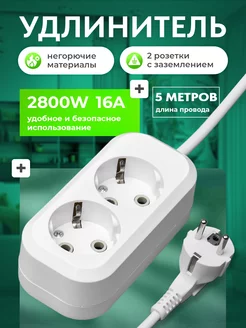 Удлинитель сетевой 2 розетки с заземлением, 5 метров, 16А