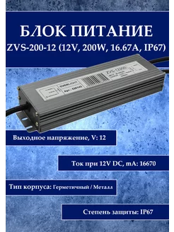 Блок питания ZVS-200-12 (12V, 200W, 16.67A, IP67)