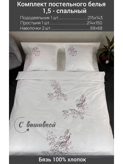 Комплект постельное белье 1,5 бязь белое с вышивкой сакура