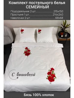 Постельное белье семейное бязь хлопок белое с вышивкой маки