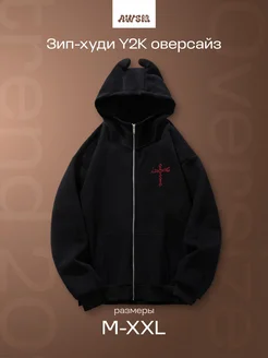 Зип худи черное оверсайз с ушками на молнии утеплённое