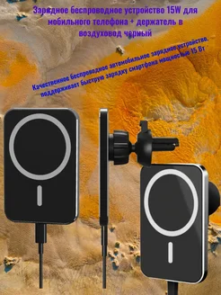 Держатель магнитный черный+Беспроводная авто зарядка 15W