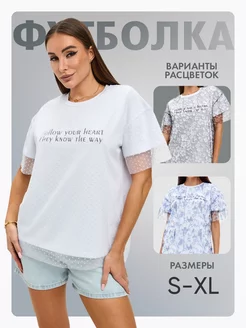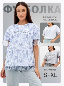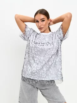 Футболка оверсайз с принтом, нарядная, сетка