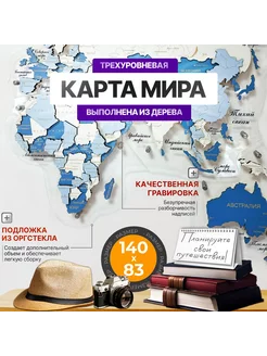 Карта мира настенная из дерева на оргстекле 140х83 см